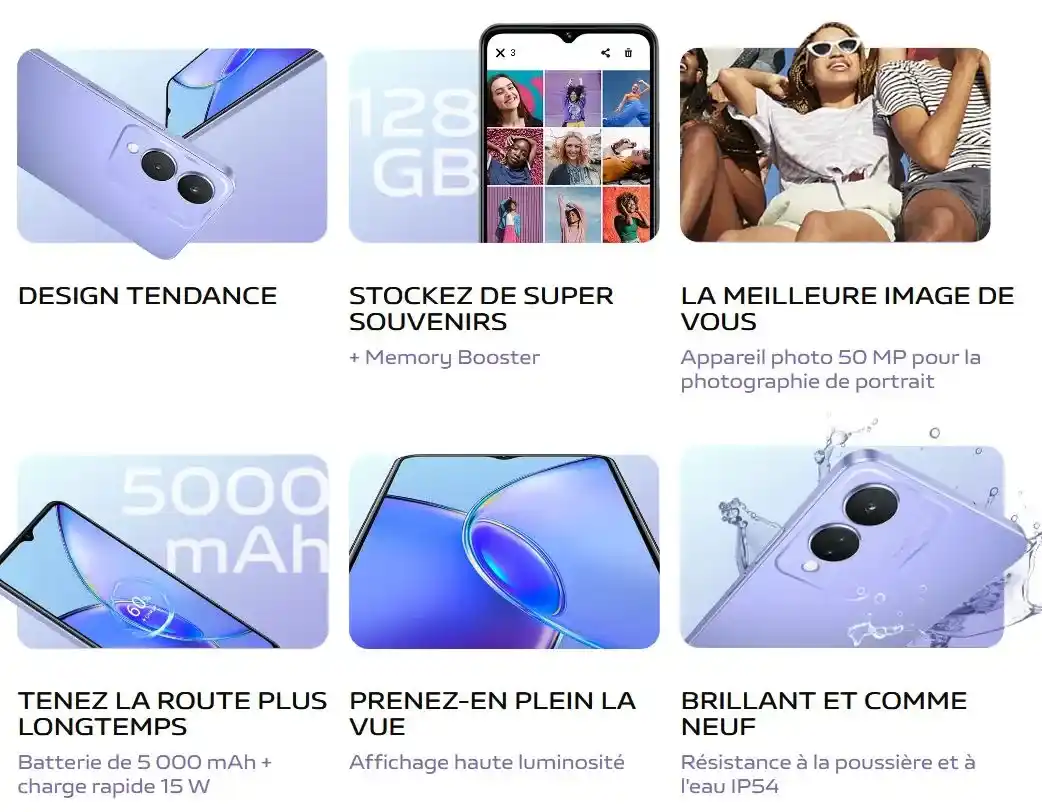 Processeur : MediaTek Hélio G85 (12 nm) Octa core(Cortex-A75 2x2,0 GHz et Cortex-A55 6x1,8 GHz) / RAM : 6 Go / Capacité : 128 Go / Écran 6,56" LCD IPS (720 x 1612 pixels) /700 nits Appareil photo : Avant 8 MP / Arrière f/1,8 (50 MP) + f/2,4 (2 MP) / Wi-Fi / Bluetooth 5.0 / GPS / 4G / Batterie : 5000 mAh / Funtouch 13 (basé sur Android 13) / Dimensions: 163,07mm x 75,4mm x 8,1mm / Poids: 186 g / Puissance de rechargement : 15 W / Capteur d’empreintes digitales / Résistant à la poussière, à l'eau et aux éclaboussures: IP54 / 2 nano SIM / Garantie 1 an